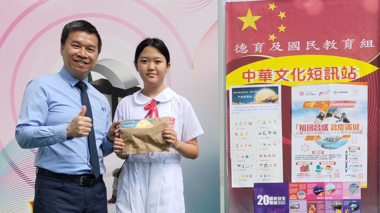 德育及國民教育組在9月份舉辦了「中秋猜燈謎活動」,讓全校學生一同慶祝中秋佳節,感受節日的氣氛。杜校長頒發禮品予猜中最多謎底的班別,並由班代表領取,以示鼓勵。