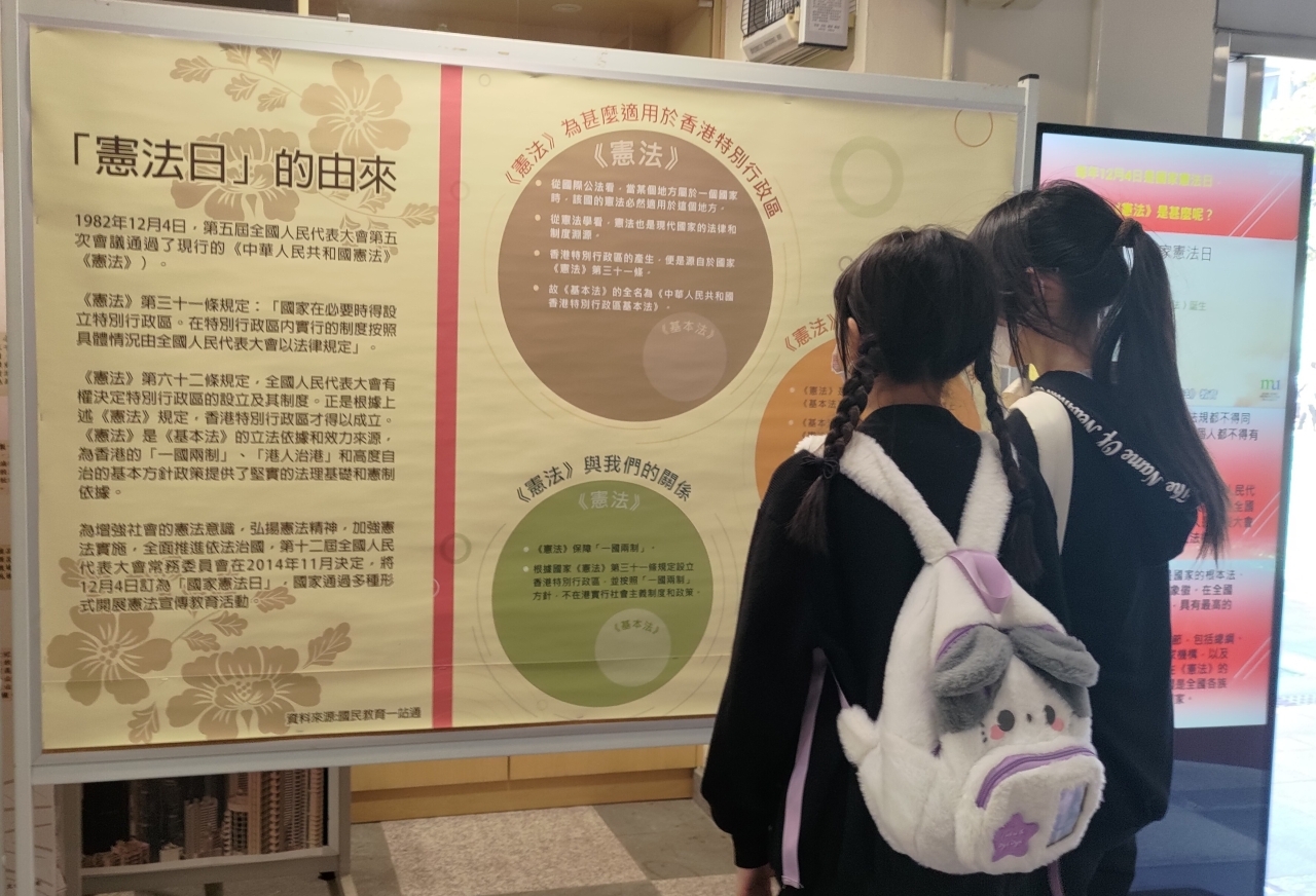 2024年12月4 日是「國家憲法日」成立十周年,學校安排了一系列有關《憲法》及《基本法》活動,透過「國家憲法」教育展板、升旗儀式及國民教育短講,旨在提升學生對《憲法》和《基本法》的認識,豐富其學習經歷及提升國民身份認同。天主教新民書院中一學生一同參與升旗儀式,表現值得欣賞。